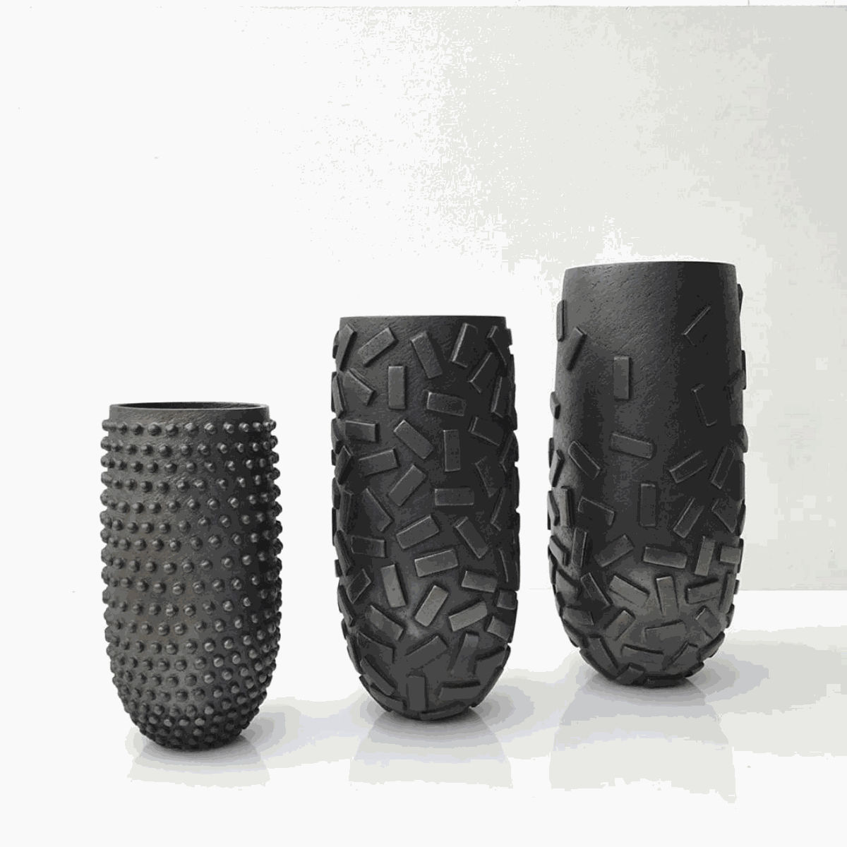 Ceramics by Sue Hanna : 3 saggar fired slim vessels, tallest height 35cm