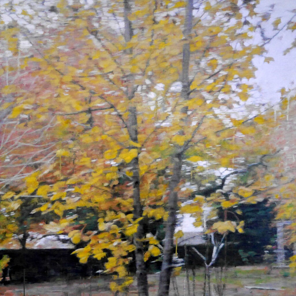 Talking about her work she said: “I had started some smaller woodland studies at the start of the year in 2020, and these have become my focus during the lockdown. They are of a wooded area near my home, 10 mins walk away, that have in them a small group of silver birch trees. I have become somewhat obsessive about photographing them each week at different times of day, different weathers, etc, and noticing the changes as the season’s progress. The resulting paintings are mostly about light, the way the pale birch trunks reflect and behave in different lights. In some ways, the lockdown has felt a bit like time standing still but going to the woods you see nature carrying on regardless and it’s quite comforting and grounding.”