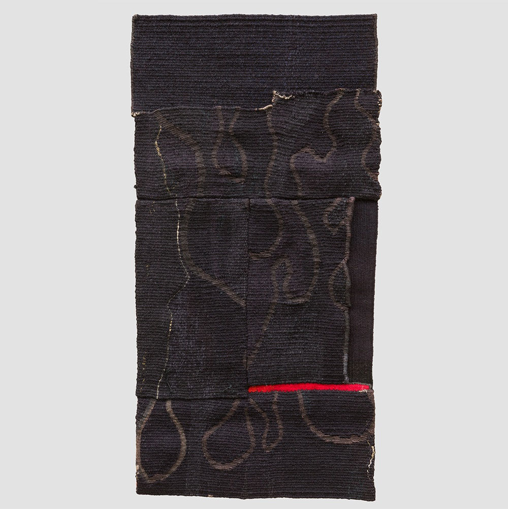 Shown here with work from Vessel Gallery by Baldwin & Guggisberg and Claire MaleThis new tapestry Echo by Jacy Wall was part of our rehang after Big Stripes went to its new home. Originally a large tapestry woven by Jacy Wall in wool and linen blacks, Echo I was part-created along with ‘Dark Banner’ (also featured in Crafting a Difference) and another work called ‘Scabard’ through deconstructing the large tapestry and then weaving new sections. In 2019 Jacy began to work with other discarded pieces of tapestry and remaining yarns she had dyed for long past projects. She called these new works from old materials the ‘Echo’ series. ‘Echo I’ is the first piece of that series.