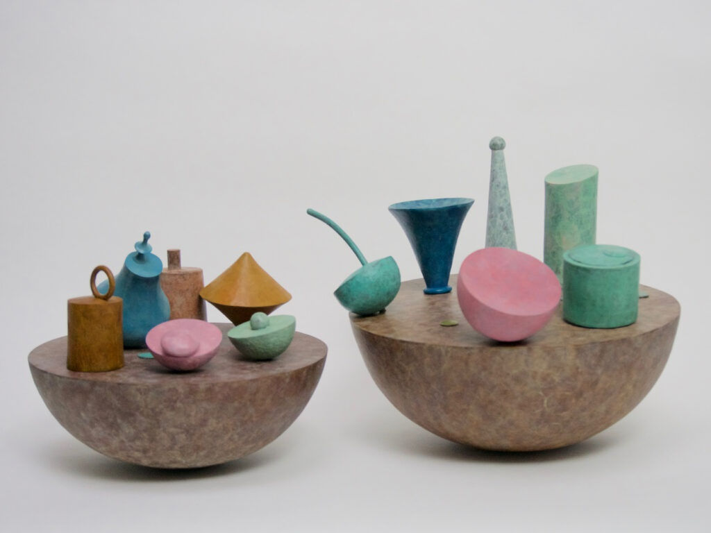 CM: Parlour Life and Balancing Act I and II came from joy in raising (the hammering process I use) as well as ideas of play, colour, balance and movement. For Balancing Act I and II, Morandi’s gentle still lifes influenced me, I like the way he uses the same ordinary forms, just changes the arrangement or the combination and the taller pieces are often painted tilting, Balancing Acts incorporates these elements in the work, giving the audience the chance to make the still life.